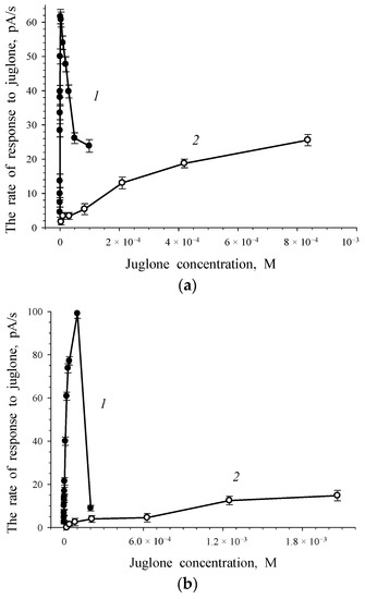 Dependences of the rate of the response to juglone on juglone concentration for intact (a) and immobilized (b) cells of Rhodococcus sp. 3 when the quinone form (curve 1) or phenolate form (curve 2) of juglone were used.