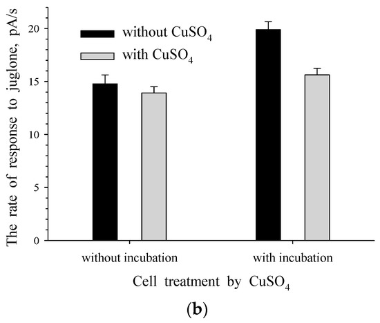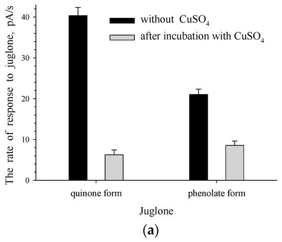 The presence of CuSO4 led to a significant decrease in the rate of the response to juglone for intact cells—for example, from 40 to 8 pA/s for the quinone form of juglone (Figure 4a). CuSO4 inhibits the activity of the enzyme, which initiates the transformation of the substrate and causes the cells’ response to the substrate. Thus, our results demonstrate that the rate of the response to juglone for the microbial reactor sensor based on intact cells of Rhodococcus sp. 3 was mainly caused by the rate of enzymatic transformation of juglone.