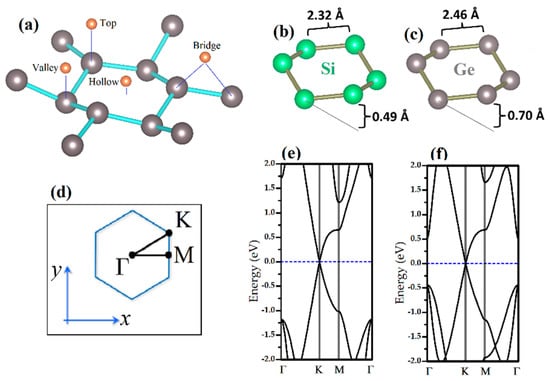 (a) Favorable adsorption sites: hollow, top, bridge, and valley for silicene and germanene. Buckled structure of (b) silicene and (c) germanene. Buckling and Si-Si and Ge-Ge distances are presented. (d) High-symmetry points of silicene and germanene. Band structure of bare (e) silicene and (f) germanene.