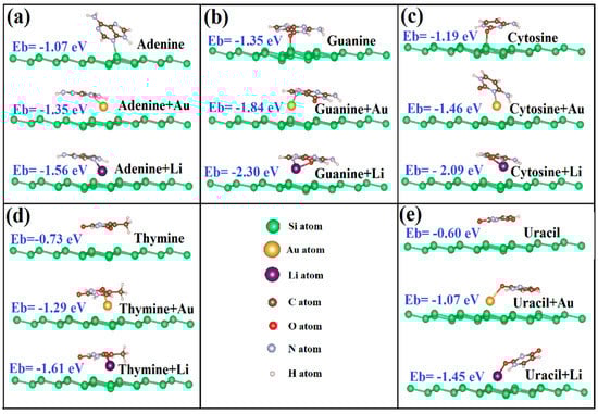 Optimized geometric structures and binding energies of nucleobases on bare and Li/Au-supported silicene. (a) Adenine, (b) Guanine, (c) Cytosine, (d) Thymine, and (e) Uracil.