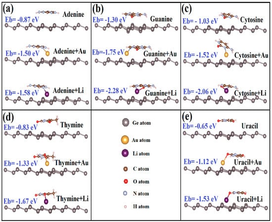 Optimized geometric structures and binding energies of nucleobases on bare and Li/Au-supported germanene. (a) Adenine, (b) Guanine, (c) Cytosine, (d) Thymine, and (e) Uracil.