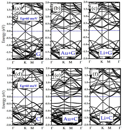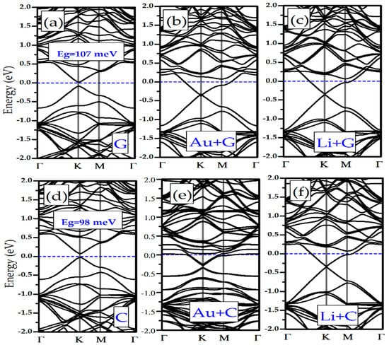 Electronic band structure of: (a) Germanene/G, (b) Au + Germanene/G, (c) Li + Germanene/G, (d) Germanene/C, (e) Au + Germanene/C, and (f) Li + Germanene/C.