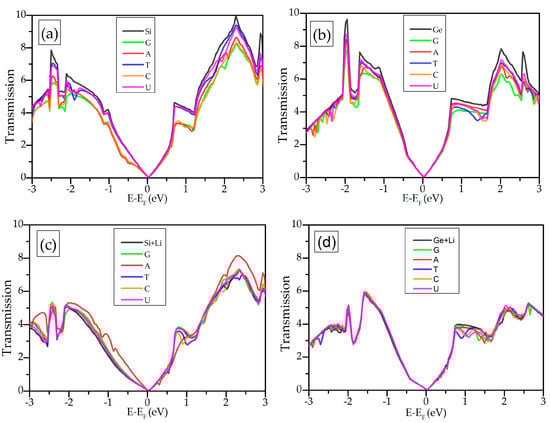 Transmission as a function of energy for each nucleobase on (a) silicene, (b) germanene, (c) Li-supported silicene, and (d) Li-supported germanene.
