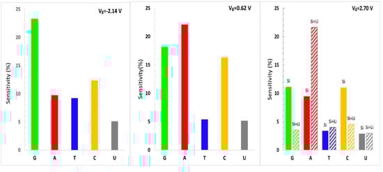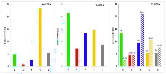 The sensitivity histogram of bare silicene/germanene (left and middle panel) and Li-supported silicene/germanene (right panel) is shown in Figure 8 and Figure 9, respectively. Our recent analysis shows that different conductance data from measurements at corresponding gate voltages allow distinguishing the nucleobases. At Vg = 0.62 V, it is possible to distinguish A from T and U. At Vg = −2.14 V, the theoretical silicene biosensor shows larger sensitivity for G and C and smaller sensitivity for U. At Vg = 2.70 V, and the bare silicene biosensor exhibits larger sensitivity for G, A, and C, while having smaller sensitivity for T and U. However, it is not possible to distinguish G, A, and C. A Li-supported silicene biosensor allows us to distinguish A from G and C for the same gate voltage. According to the sensitivity analysis of bare silicene distinguishing of T and U, it would not be as easy as G, C, and A. This problem can be solved by using a Li-supported silicene biosensor device. We note that the Li-supported silicene biosensor device can have be much more effective than the bare silicene biosensor device in distinguishing the DNA/RNA nucleobases.