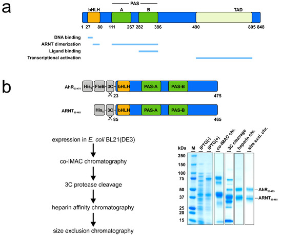 The evolutionary highly conserved aryl hydrocarbon receptor (AhR) is a ligand-dependent transcription factor that mediates responses to environmental pollutants, as well as dietary-, cell- and microbiota-derived metabolites [6]. Although originally identified as dioxin receptor, extensive research in the last years has demonstrated that the receptor is a key regulator of a broad spectrum of physiologically relevant functions, spanning from xenobiotic metabolism to developmental biology, as well as immunity [7,8,9,10]. Notably, its high relevance in the immune response of vertebrates, as well as the involvement in the onset of pathological conditions, e.g., cancer and autoimmune diseases, makes the AhR a promising target for drug development and host-directed therapy (HDT) [7,9,11]. As a member of the basic helix-loop-helix PER-ARNT-SIM (bHLH-PAS) protein family of transcriptional regulators, the AhR is characterized by a modular organization of regulatory domains, comprising an amino-terminal bHLH DNA binding domain that is contiguous to a tandem PAS A and PAS B domain (Figure 1a) [6,7]. The PAS B domain encompasses the receptors ligand-binding capability [6]. While the AhR domain architecture and the multifarious interactions with various proteins that enable the activation of different signaling pathways are well described [6,7], little is known about the molecular processes of AhR ligand recognition. This is mainly because the crystal structure of the PAS B ligand-binding domain still remains to be solved. Moreover, although numerous AhR ligand binding analyses have been reported in the literature, in their majority radioligand competition assays and others are focusing on murine and rat AhR or species other than human [12,13,14]. Until now, the lack of a robust recombinant expression system that allows for high-level production of functional human AhR has limited the development of a reliable and sensitive ligand binding assay that enables quantitative measurements of ligand binding affinities. Currently used methods (e.g., virtual ligand screening with in silico docking combined with in vitro studies using AhR-dependent reporter gene induction assays or traditional radioligand binding experiments) often result in divergent values, are time-consuming, and do not allow for determination of direct binding, which is a critical aspect in drug discovery [12,15,16]. Therefore, we aimed to establish a robust protocol that allows for testing binding affinities of a purified recombinant human AhR to small molecules by using MST.