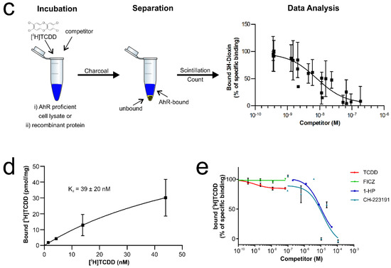 Verification of the ligand-binding properties of the recombinant hAhR-mARNT by radioligand binding assay. (a) Functional domains of the human hAhR. Numbers indicate amino acid residues displaying the relative domain boundaries. (b) Schematic representation of the AhR-ARNT protein complex purification. Both proteins were co-expressed in E. coli BL21(DE3) and purified in a 3-step purification process. Samples from different steps of the purification were analyzed by SDS-PAGE and Coomassie staining. The theoretical molecular weight of the AhR and ARNT after cleavage with 3C is 51 and 40 kDa, respectively. (c) Principle of the radioligand binding assay. AhR-deficient and -proficient liver lysates are incubated with radioactively labeled [3H]TCDD and, in case of competition assays, in presence of increasing concentrations of unlabeled competitor ligands. After incubation, charcoal is added to remove unbound tracer molecules and radioactivity of the supernatant is measured. Specific binding of radioactively labeled [3H]TCDD is calculated by fitting the experimental data with nonlinear regression after the subtraction of non-specific binding derived from AhR knockout liver lysates. The graph presented is exemplarily and is not based on experimentally derived data. (d) Saturation binding analysis of the purified AhR-ARNT receptor complex incubated with different concentrations of radioactively labeled [3H]TCDD. (e) Concentration-dependent displacement of [3H]TCDD from AhR-ARNT co-incubated with increasing concentrations of unlabeled competitor ligands. After 24 h, radioactivity in the supernatants was measured and competitive binding after NSB-subtraction was calculated. Data are mean ± SD of two independent experiments performed with triplicates.