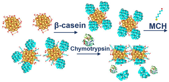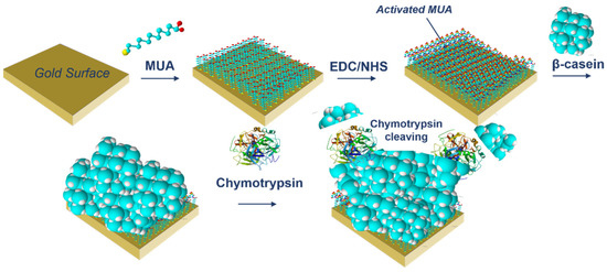 The scheme of gold nanoparticles (AuNPs) modification by 6-mercapto-1-hexanol (MCH) and β-casein and cleavage of β-casein by chymotrypsin.