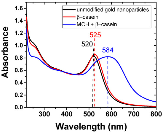 Absorption spectra of unmodified gold nanoparticles (AuNP) (black) and those modified by β-casein (red) and by β-casein + MCH (blue). The numbers at upper part of absorption peaks are wavelengths in nm.