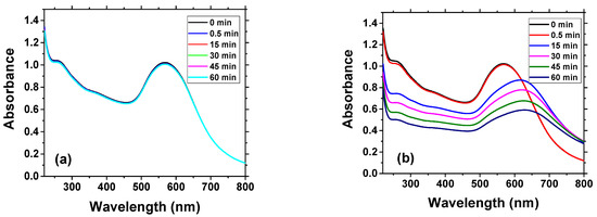 Changes of absorbance spectra of the suspension of AuNPs modified by β-casein and MCH in time for (a) 0.1 nM chymotrypsin and (b) 10 nM chymotrypsin.