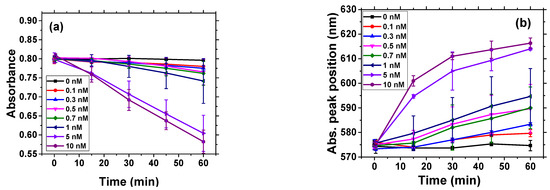 The changes of absorbance spectra of AuNPs suspension have been measured during the chymotrypsin cleavage at 0 min, 0.5 min,15 min, 30 min and 60 min. Changes in spectra over time for two different concentration of chymotrypsin are presented in Figure 4. At a relatively low concentration of chymotrypsin (0.1 nM), we did not observe significant changes of the absorbance (Figure 4a). However, at higher chymotrypsin concentration, around 10 nM, a substantial red shift of the spectra was observed (up to 615 nm). It can be also seen that after maximum shifting substantial decrease of the absorbance with time occurred.