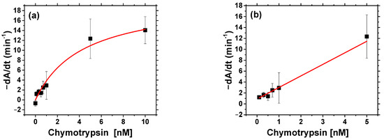 We were able to use reverse Michaelis—Menten model to analyze the obtained data. However, instead of substrate concentration, the concentration of chymotrypsin, c, has been used in this model: v = vmax [c/(KM + c)], where v and vmax are the rate and maximum rate of enzyme reaction, respectively, and KM = 3.89 ± 1.24 nM is reverse Michaelis—Menten constant obtained from the fit using the Michaelis—Menten model (R2 = 0.96) (Figure 6b). In our case, v = dA/dt and vmax = (5.3 ± 0.9) × 10−3 min−1. However, this model was used only formally because of different restraints. The main assumptions of the excess enzyme and limited substrate concentration was reversed in this case and instead, the concentration of the enzyme changed while the substrate was presented in excess. This implies different meaning of KM (compared to the Michaelis—Menten model) which now represents the concentration of enzyme at which the rate of reaction is half of the maximum instead of concentration of substrate. A limitation of this approach is the assumption of substrate excess; nevertheless, it can be used for good approximation [25]. To calculate LOD, we used only part of the calibration curve from 0 to 5 nM, where the plot of dA/dt vs. c was almost linear. The results are shown in Figure 6b.