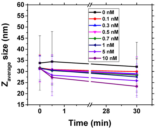 We also constructed a calibration curve based on the percentual change of Z-average size in 30 min (Figure 8a) and fitted this by reverse Michaelis—Menten model. About 25% of the Z-average size was observed in 30 min. However, we can also see that the data has quite large (5 nm) standard deviation (obtained from 3 independent experiments at each concentration of chymotrypsin) affecting accuracy of concentration measurements, and the LOD of the sensor. Nevertheless, it is still a useful method to detect presence of chymotrypsin in the sample. The standard deviation could be improved by increasing number of measurements of the sample. It is important to note that the enzyme reaction was used without buffering the solution, which could also lead to a large value of standard deviation. The recommended buffer for chymotrypsin is 100 mM Tris-HCl at pH 7.8 (optimum pH) containing 10 mM CaCl2 for stability. However, since we observed AuNPs aggregation in buffer, the experiments were carried in un-buffered solution. The calibration curve seems to be saturated near the 10 nM chymotrypsin.