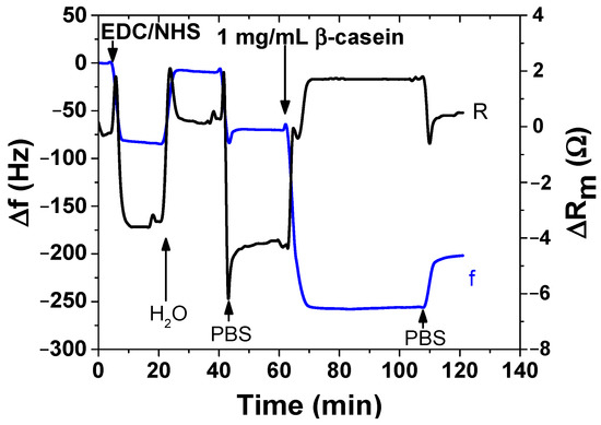 The acoustic QCM sensor was prepared using an AT-cut quartz piezocrystals (fo = 8 MHz, ICM, Oklahoma, OK, USA) with sputtered thin gold layers of an area A = 0.2 cm2, that served as electrodes. First, the crystal was carefully cleaned as follows. It was exposed to a basic Piranha solution (H2O2:NH3:H2O = 1:1:5 mL). The crystals were immersed for 25 min in this solution, in beakers in a water bath (temperature was approximately 75 °C). Subsequently, the crystals were withdrawn, rinsed with distilled water, and returned to the beaker with a new dose of Piranha solution on the reverse side of the crystal. This was repeated three times. On the last extraction, the crystals were washed three times with distilled water and then with ethanol and placed in a bottle containing ethanol for storage at room temperature. The clean crystal was incubated overnight for 16–18 h at room temperature with 2 mM MUA dissolved in ethanol. MUA is a carboxylic acid with a sulfide group (SH). The sulfide moiety interacts with the gold on the crystal to form a self-assembled layer. After incubation, the crystal was washed with ethanol, distilled water, and 20 mM EDC and 50 mM NHS were applied for 25 min. These substances react with the carboxyl moiety of MUA and activate them to form a covalent bond with amino acids. Subsequently, the crystal was washed by distilled water, dried with nitrogen, and placed in an acrylic flow cell (JKU Linz, Austria). The cell was filled with PBS buffer using a Genie plus 2011 step pump (Kent Scientific, Torrington, CT, USA) at a flow rate of 200 μL/min. After filling the cell, we switched the flow to the rate of 50 μL/min. Then, 1 mg/mL of β-casein dissolved in PBS was allowed to flow under the crystal modified by MUA layer. After 35 min, only pure PBS was flowed in order to remove the unbound β-casein. All steps of the preparation of β-casein layer were recorded using a research quartz crystal microbalance (RQCM) instrument (Maxtek, East Syracuse, NY, USA).