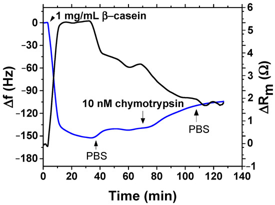 After β-casein was bound to the surface, we could study its cleavage by different concentrations of chymotrypsin under flow condition for 35 min. An example of the changes of resonant frequency and motional resistance following the addition of 10 nM chymotrypsin are shown in Figure 10. In the presence of chymotrypsin, the resonant frequency increased by 35 Hz, but motional resistance decreased by 1.6 Ω. This is clear evidence of the cleavage of β-casein by chymotrypsin. Decrease of motional resistance can be due to an increase of molecular slip, which can be caused by weaker viscosity contribution.