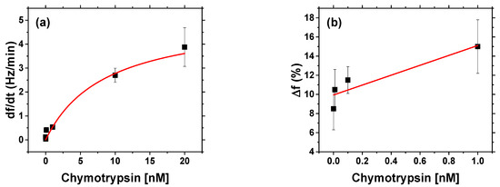 (a) Calibration curve for chymotrypsin fitted by reverse Michaelis—Menten model, v = df/dt was the first derivation of frequency obtained from kinetic curve. (b) Calibration curve: changes in frequency Δf = (Δfchymo)/(Δfcasein) × 100 where Δfchymo = f − f0 (where f is steady state frequency following addition of chymotrypsin and washing the surface by PBS and f0 those prior addition of chymotrypsin) is change in frequency after chymotrypsin cleavage and Δfcasein is frequency change after formation of β-casein layer. vs. lower chymotrypsin concentration range for determination of LOD. (Δf = 5.17%nM−1c + 9.94%, R2 = 0.84, where c is the concentration of chymotrypsin). The results represent mean ± SD obtained from 3 independent measurements at each concentration of chymotrypsin.