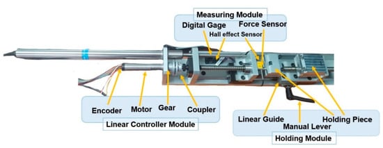 The linear controller module consisted of a brushless DC servomotor with an EPOS positioning controller (Maxon, Sachseln, Switzerland) and included an encoder with a harmonic gear (a reduction ratio of 83:1). The rotation was transmitted through a coupler to move a linear guide. The positioning controller also included two Hall effect sensors locating at the bottom of the system unit so that they could function as a limit switch for a safety mechanism. The controller communicated with the computer via a USB connection.