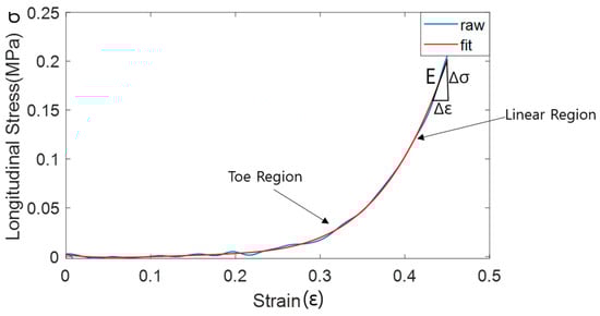 An example of the raw and fitted strain vs stress curve in the longitudinal direction.