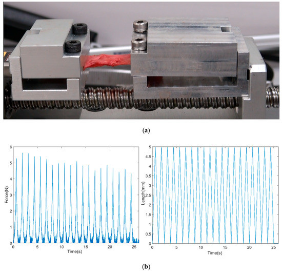 The measuring module consisted of a force sensor (Futek, LSB200, Irvine, CA, USA) to measure the tensile force (up to 445 N) and a digital gauge (Magnescale DK100PR5, Tokyo, Japan) to measure the elongation of the specimen (up to 100 mm with 4 μm accuracy). Those specs were sufficient to quantify our study since the elongation was in the order of mm, and the force was in the order of N. The force sensor was located between the bracket and the side holder where the linear motor with a guide moved (Figure 1). In this setup, when the initial length of the specimen was changed with the manual maneuver during multiple test trials, accurately tracking the linear position of the specimen could be difficult with the encoder that measured the relative linear position. Thereby, the digital gauge was added to know the true linear position so that the strain of the specimen could be computed. The base of the QD holding the modules had a width of 7 cm and a length of 42 cm.