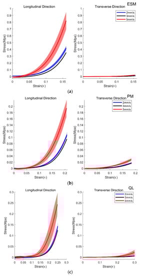 There was a significant effect of the direction on the young’s modulus of all samples, namely, ESM, QL, PM, ALL, and PLL (p < 0.001 for all cases). The young’s modulus of all samples was large in the longitudinal direction compared to the transverse direction as seen from Figure 5 and Figure 6. Velocity-dependent behaviors of the stress and strain were found in the specimens (Figure 5 and Figure 6). There was a significant effect of the speed on the ESM, QL, PM, and PLL (p < 0.001, p = 0.025, p < 0.001, and p < 0.001, respectively), and there is a marginally significant effect of the speed on the ALL (p = 0.051). Especially, the speed-dependent differences were large in the specimens elongated in the longitudinal direction. Table 2 lists the means and SD of the young’s modulus of ESM, PM, QL, ALL, and PLL in the longitudinal direction and the transverse direction. There was a significant effect of the interaction between the direction and the speed on the ESM, PM, and PLL (p < 0.001, p = 0.001, and p < 0.001, respectively). Posthoc analysis revealed that there were significant differences in the direction between the all samples as p < 0.001, and in the speed between the 2 mm/s and the 5 mm/s conditions, and the 3 mm/s and the 5 mm/s conditions of the ESM (p < 0.001 and p = 0.001, respectively), between the 2 mm/s and the 5 mm/s conditions and the 3 mm/s and the 5 mm/s conditions of the PM (p < 0.001 and p < 0.001, respectively), and between the 2 mm/s and the 3 mm/s conditions of the PLL (p = 0.002), and the 2 mm/s and the 5 mm/s conditions of the PLL (p < 0.001), and the 3 mm/s and the 5 mm/s of the PLL (p < 0.001).