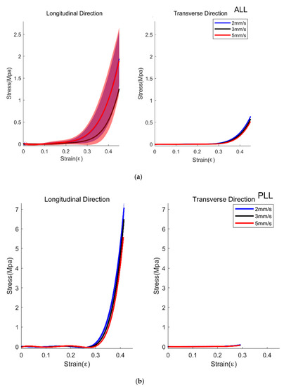 Average Strain and Stress curve of Anterior Longitudinal Ligament (ALL, (a)) and Posterior Longitudinal Ligament (PLL, (b)). The blue line with shading, mean±1SD for 2 mm/s trials; black line with shading, mean ±1 SD for 3 mm/s trials; red line with shading, mean ±1 SD for 5 mm/s trials.