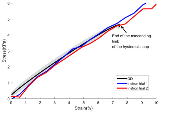 As seen from Figure 7, the slopes of elongation trials from Instron were mainly within the range of confidence interval of the slopes obtained from the QD. The young’s modulus of the Instron trial 1 was 569.9 kPa and the Instron trial 2 was 578.4 kPa, which were within the 95% confidence interval value obtained from QD (the lower bound: 560.3 kPa and the upper bound: 603.0 kPa). While the QD can repeat the stretch-relax of the specimen, the Instron setup used in this study can only stretch until the specimen is reached to failure. Thereby, in Figure 7, the range of strain in the Instron trial exceeds the range of strain obtained from the QD as indicated from the end of the ascending limb of the hysteresis.