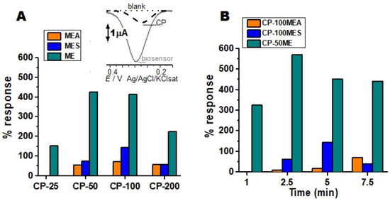 As shown in Figure 1, the best biosensor was the CP-50ME with an enzymatic reaction time of 2 min and 30 s, it showed 3% deviation from analytical response value in relation to CP-100ME, the CP-25ME obtained 65%, and the CP-200ME presented 48% of analytical response for the substrate in relation to the best sensor. CP50-ME biosensor was standardized under ideal conditions for the other tests, due to its better catalytic response. The CP-25 in MES and MEA did not show significant results in relation to unmodified CP.