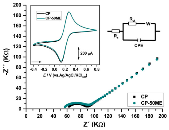 Nyquist plots for CP and CP-50ME. Inset: Cyclic voltammograms at. All analyses were carried out in 0.1 M KCl solution containing 50 mM K4(Fe(CN)6)/K3(Fe(CN)6).