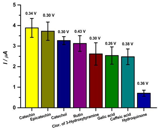 Standard substances were used to test the analytical capacity of the proposed biosensor against different phenolic compounds, such as catechin, epicatechin, catechol, 3-hydroxytyramine hydrochloride, caffeic acid, gallic acid, and hydroquinone (Figure 3).