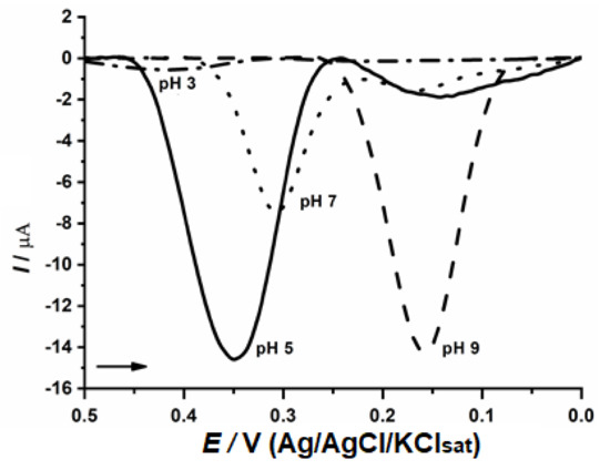 The evaluation of optimal pH was performed (Figure 4) and pH 5.0 exhibited the best result which is in agreement with previous publications for fungal enzymes [19,34]. The electrochemical measurements were performed at this pH, maintaining the ideal conditions for optimizing the enzymatic activities and the active site substrate interaction.