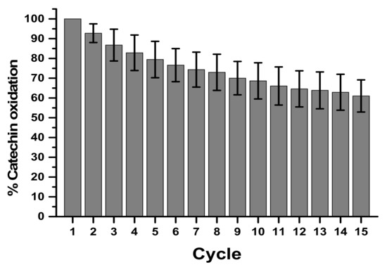 Still in relation to the performance of the biosensor, successive measurements with the same electrode were performed at a concentration of 30 µM (Figure 5). The reuse showed a catalytic decay of 39% at the end of 15 cycles in the determination of catechin. Evaluating the percentage of activity and decay of the biosensor together with the variation coefficient, the 5th cycle presented 83 ± 11.16%, in the 10th cycle 70 ± 12.13%, and in the 15th cycle 61 ± 13%, which on average generates a variation of approximately 13% every 5 cycles. The satisfactory reuse will be until the 8th cycle, which presents a 20% decay, corroborating data from the literature for biological samples [35].