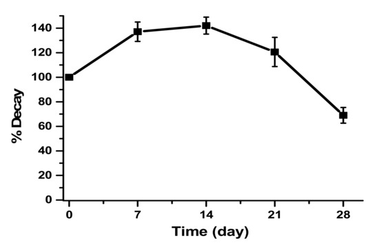The carbon paste modified with the crude enzymatic extract was also stored for the construction of the biosensor (Figure 6). Storage was performed at 4 °C and the decay of the enzymatic activity of the biosensor was monitored for 28 days.