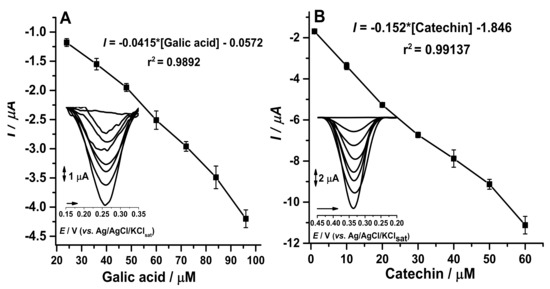 With the adjustments of enzyme extract concentration in the manufacture of the biosensors, time of enzymatic reaction between biosensor and analyte, optimal pH, reuse cycles, and storage time allowed the calibration curves to be carried out for catechins and gallic acid (Figure 7). According to data in the literature, commercial samples of green tea (Camellia sinensis) have a large amount of catechin and gallic acid [38,39].