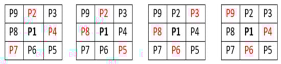 A second thinning operation is required, at every point along the centreline, checking pixel P1 for more than two neighbouring pixels. If this was true, then the logic of the image was calculated. This operation makes BI (P1) = 0 if the corner pixel and the pixels opposite to it in the two complimentary cardinal directions are one and create an exhaustive list of situations where P1 are 0, this logic is visually shown in