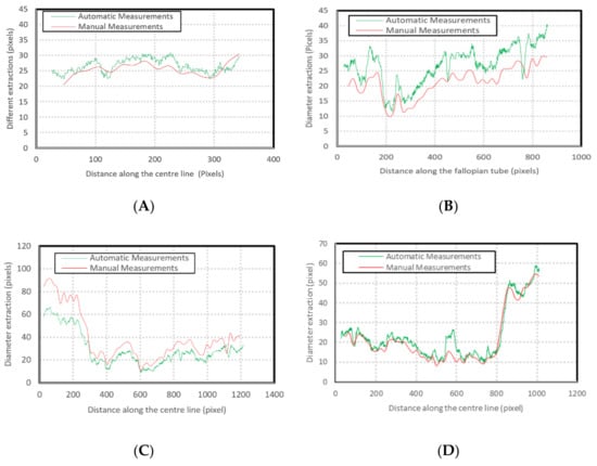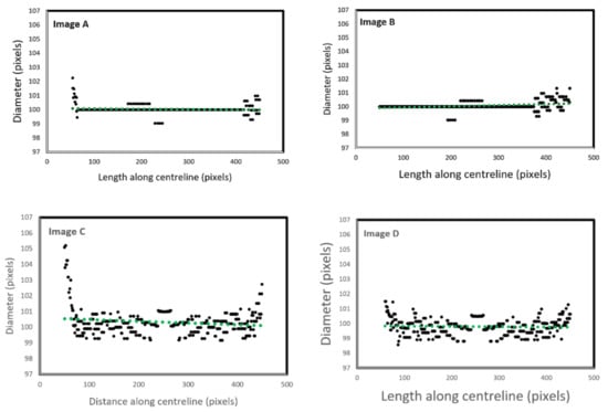 Figure 5 illustrates the automatic visual measurements of the tubal diameters among the controlled images. Small noises oscillate at the images’ extremes due to the thinning algorithm’s initiation, at points where the object edges are undefined. The algorithm thins the image wall and the edges causing initial centreline extraction errors, then rectifies after the entire vessel definition is within the image. Interpolation could partially rectify these faults. This approach would be unsuitable for a large variety of vessels as any possibility of edge positions could be outside the image, adding uncertainty. It is more accurate to leave the algorithm in its current state, analysing only the provided data, giving high accuracy of 1-pixel error in the interest areas within the domain of (75, 500) pixels.