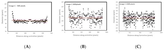 Figure 5C). Accuracy reduces with image resolution. In the images, the red line trends are aligned to the actual diameters. However, the total report error for the 1500 pixels is 3%, which makes the algorithm reliable even for bigger size images.