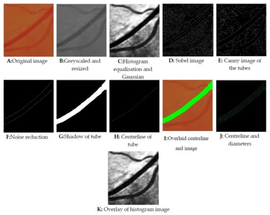 1]. In essence, the algorithm converts the RGB image [A] to greyscale [B] immediately on receipt. Then the histogram equalisation [C] is applied to improve the dynamic range of the image. The Sobel [D] and Canny [E] images follow finding all potential edges on the image, further processed using a noise reduction [F] technique to eliminate lower quality edges in the image (such as those too short or ill-defined). Sobel Operator is employed as a filter to extract the edges of the vessels, and a Canny edge detector is used to minimise the noises of the processed images further. Then a centreline is thinned [H] from the shadow of the vessel [G]. Overlaying the centreline and image shadow [I] on the original image demonstrates the algorithm’s accuracy. Applying the histogram image overlay [K] improves the edges’ visibility, including the centre line and diameter [J] evaluation lines. The algorithm finally outputs a diameter estimation (As the tube’s diameter is non-uniform along the tube).