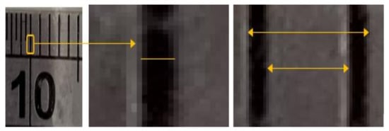 Figure 11, each line of the division contains almost 8 pixels. On the other hand, each division which is 1 mm, is between 27 and 43 pixels. In this particular measurement, the algorithm automatically selects a pixel size of 35 pixels/mm.