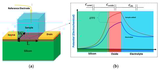 (a) The standard structure of a Bio-field-effect transistor (FET); (b) the corresponding potential diagram showing the effect of electrolyte on the potential of interfaces. The potential at the oxide layer and solution interface arises then will be decreased gradually to the solution potential. Adding the sample would manipulate this potential curve influencing the charge transport inside the silicon channel. There are three main capacitances involved in the system consisting of the oxide, channel depletion capacitance, and the solution double layer (CDL).