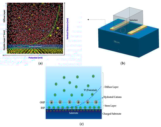 These principles work for semiconductor-oxide-electrolyte Chem/BioFET regardless of their geometries and channel-gates arrangement. However, the principle might not be applied to some specific Chem/BioFETs, which are working based on the sensing properties of nanomaterials like graphene or carbon nanotubes (CNTs). This fact stems from the fact that the ion complexation on these surfaces might not follow the site-bonding theory. Mathematical modeling of the molecular interaction at the surface (oxide or nitride) is extremely difficult, thus prediction of surface potential will be impossible like what site-bonding theory provides. However, in terms of modeling the interaction in BioFET surface complex systems, recently atomistic molecular dynamics simulation has been recruited to analyze the ion complexation on the surface and measure the surface potential on the channel [33,34,35]. State-of-the-art molecular analysis has empowered researchers to get insight into the molecular interactions at the channel surface and estimate the double-layer capacitance considering the interaction of nanomaterials, oxide, ionic solution and proteins on the surface, which is not practical possible with current models. Figure 2a–c represents the surface potential in a very complex system containing ionic solutions.