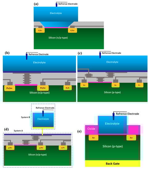 All structures of metal-oxide-semiconductor (MOS)-based ion-sensitive field-effect transistors (ISFETs) platforms that have been used for Chem/BioFET applications: (a) Representation of Oxide-electrolyte gate Chem/BioFETs, which include a reference in a solution on top of the oxide layer; (b) showing the floating gate structure by which the solution area has been separated from the conduction channel by an internal connection from the oxide layer on top of the channel to the solution and sensing membrane; (c) a demonstration of the integration of a floating gate with control gate, which helps to have more accurate control over the gate operation; (d) shows extended gate structure that allows us to have a bigger sensing area for biosensing purposes. Moreover, an extended gate creates enough room for further integration with the microfluidic system, which in most cases was not applicable to add them to small ISFETs; (e) oxide-electrolyte gate Chem/BioFET with the back gate in which used the back gate in order to manipulate the working point of the sensor by changing the depletion effects in the conductive channel.