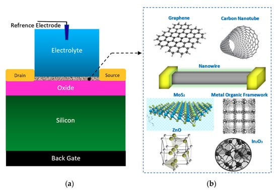 The general form of electrolyte and back gated structures of FETs, which have been used for the sensing elements in Chem/BioFET: This nanomaterial-based structure has been widely used for cell, DNA, enzymatic reaction and chemical sensing; (a) sensor structure; (b) the most frequent nanomaterials used as sensing element and main conductive channel.