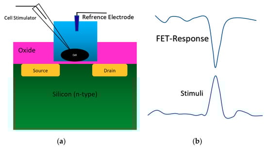 The stimulation and the response of FET sensor from a cell on top of an oxide-semiconductor. (a) Sensor structure for culturing cell on the oxide layer on top of the conductive channel; (b) the stimuli and the sensor response at the same time, which shows the successful loading and recoding a pulse onto/from the cell using ISFET sensor. The FET-response is “current”, and the stimulus is voltage.