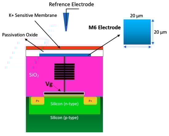 Using the well-matured CMOS technology as the main platform for the development of ISFET was a smart step toward the development of very standard ISFET sensors for biological applications [22,63]. As an example of the transfer characteristics, the fabricated circuit delivers a linear dynamic range of 2.5 V that allows each individual ISFET to operate as a pH sensor in the array [58]. The ISFETs have a threshold voltage of −1.5 V and a sensitivity of 46 mV/pH [58]. Using unchanged CMOS structures (see Figure 3b) for ISFET sensors comes with some advantages that make this structure very competitive in comparison to other Chem/BioFET structures. CMOS adaptation makes Chem/BioFET-based sensors very scalable and low-powered, and are being considered as two main demanding characteristics for handheld PoC devices. As shown in Figure 6, this sensor is fabricated by connecting the elongated gate of a transistor up to the solution that perfectly separates the solution from the sensor area. The gates, through some metal connectors buried in the oxide layer of CMOS, will be connected to the layers of Si3N4, SiO2, etc., which play the role of ion complexation surface for H+ sensing [22]. As an example of the unchanged CMOS sensor, Milgrw et al. [63], used a 16 × 16 array of these sensors for direct extracellular imaging. The structure of this sensor has been shown in Figure 7.