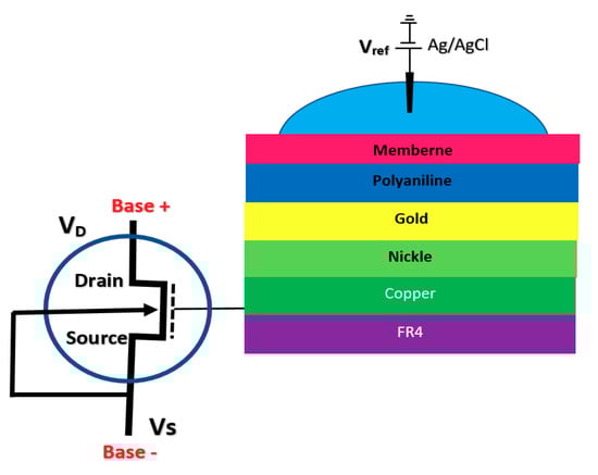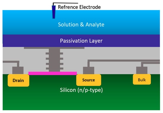 Due to the superior sensing characteristics of field-effect transistors (FETs), they have attracted huge attention in the biosensing research community with the motivation to create disposable, low-cost, miniaturized PoC devices based on FET sensors for home diagnostic purposes. The superior technological features of these sensors have huge potential for miniaturization, parallelization, ultra-low response times and seamless capability to be integrated with CMOS technology [12,13,14]. Historically, ISFETs were firstly introduced in the early 1970s by a subtle variation in the metal-oxide-semiconductor FETs (MOSFETs), which was removing the metal layer on top of the oxide layer [15]. Initially, it was conceived that by removing the metal gate on top of the oxide layer in MOSFET, space would be dedicated to an electrolyte solution as the fluidic gate in which a reference electrode (RE) can manipulate the surface potential of the oxide layer by changing the voltage.
