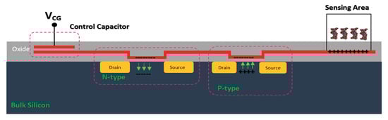 Commonly, a floating electrode is used to protect the oxide sensing region on top of the channel and also provide better control over the sensitivity of the device in different operation settings, which is a preferred condition when it comes to having uniform modulation of the sensor. As shown in Figure 8, the floating gate-based Chem/BioFET structure includes two gates, one for exposure to biological samples and another one for controlling the gate. This gate structure has been used successfully for the investigation of DNA charges on the surface of oxide as depicted in Figure 8.