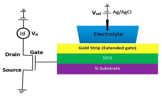 Due to the specific characteristics of extended gate FET for biosensing applications, many are designed for various detection applications such as pH, urea, glucose, calcium ion, DNA, and immunosensors, which have been registered. A complete review of these sensors is done in other work by Pullano et al. [75]. An extended gate sensor was used for direct potentiometric serological diagnosis toward detection of Bovine Herpes Virus-1 (BHV-1) pathogen by Tarasov et al. [77]. Their design has been shown in Figure 10, which demonstrates an extended gate connected to the gate of a MOSFET. In their experiment, concentrations of p53wt changed from 50 pM to 10 nM, whcih resulted in Ids jumps ranging from about −5.0 × 10−8 A up to about −5.0 × 10−7 A.