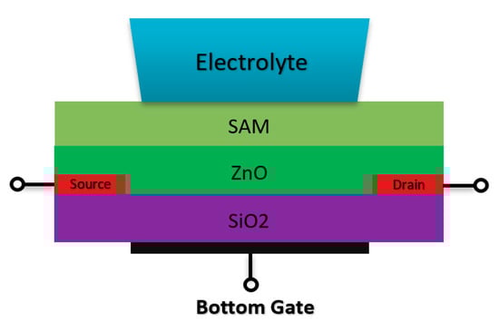 Double gate structure Chem/BioFET designed based on the double gate structure. The SiO2 is placed at the back of the channel (ZnO) and the electrolyte solution has been placed on top of the sensing layer on top of the conductive channel.