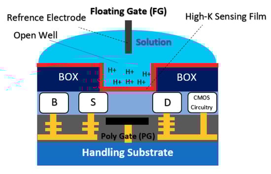 The double gate structure was also reported by Huang et al., as an efficient way to improve the performance of standard CMOS-based ISFETs. They reported a dual-gate ISFET sensor structure, as depicted in Figure 12, which is developed in a standard 0.18 µm SOI-CMOS process followed by an additional backside process [81]. Using poly gate (PG) (see Figure 12) as the second gate of double-gated CMOS standard ISFET structure, helped them to significantly improve the characteristics of ISFETs such as 155 times improvement in signal-to-noise ratio (SNR), 53 times improvement in drift rates, 3.7 times hysteresis reduction, and last but not least, 7.5 times sensitivity increment [82]. Back gate structure has been used frequently in FET structures in which nanomaterials (please see Figure 3b) were deposited on the oxide and played the role of main conductive channel. The most noteworthy ones are CNT-based FETs [83], grapheme-FETs [82], silicon nanowire (SiNW)-FETs [84], MoS2 FETs [85], MOF FETs [42], ZnO FETs [42,86] and other nanomaterials utilized the double gate and in the form of a solution gate and a back gate for sensing procedures.