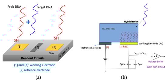 Lee et al. [88] developed an extended gate Chem/BioFET structure (see Figure 14) that has been manufactured based on the 0.35 µm CMOS process, which was integrated with working electrodes, an RE and readout circuits into one package. A detectable range of 88.3 dB and an LoD of 36 µV were reported for this sensor, which led to a successful Chem/BioFET for the detection of oligonucleotide sequences derived from the H5N1 avian influenza virus (AIV). The structure of this sensor is introduced in Figure 14a,b, which shows a conceptual view of the integration and working principle of the device. All of the electrodes were built in the device area, which included working electrodes, an Au (numbers (1) and (3)) modified along with DNA strands and an RE (Al, number (2)) that determines the potential of the analyte solution. After the introduction of the sample on the functionalized extended gate, the signal will be processed in the CMOS circuitry.