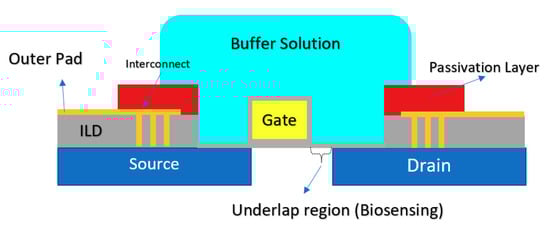 Another CMOS-based Chem/BioFET platform is shown in Figure 15 that utilizes a gated area on the main channel while the solution is introduced onto the sensor through an underlap region [89]. In the sensor shown in Figure 15, to examine the effect of hydrophilicity and hydrophobicity on the response of the sensor, a thin film of CYTOPTM and silicon nitride has been used as the hydrophobic and hydrophilic passivation layers, respectively. The sensor finally was tested toward detection of surface antigen and its specific antibody of the AIV. This work introduced a method for enhancement of the sensitivity of CMOS-based Chem/BioFET sensors for better detection of infectious disease and in particular influenza [89].